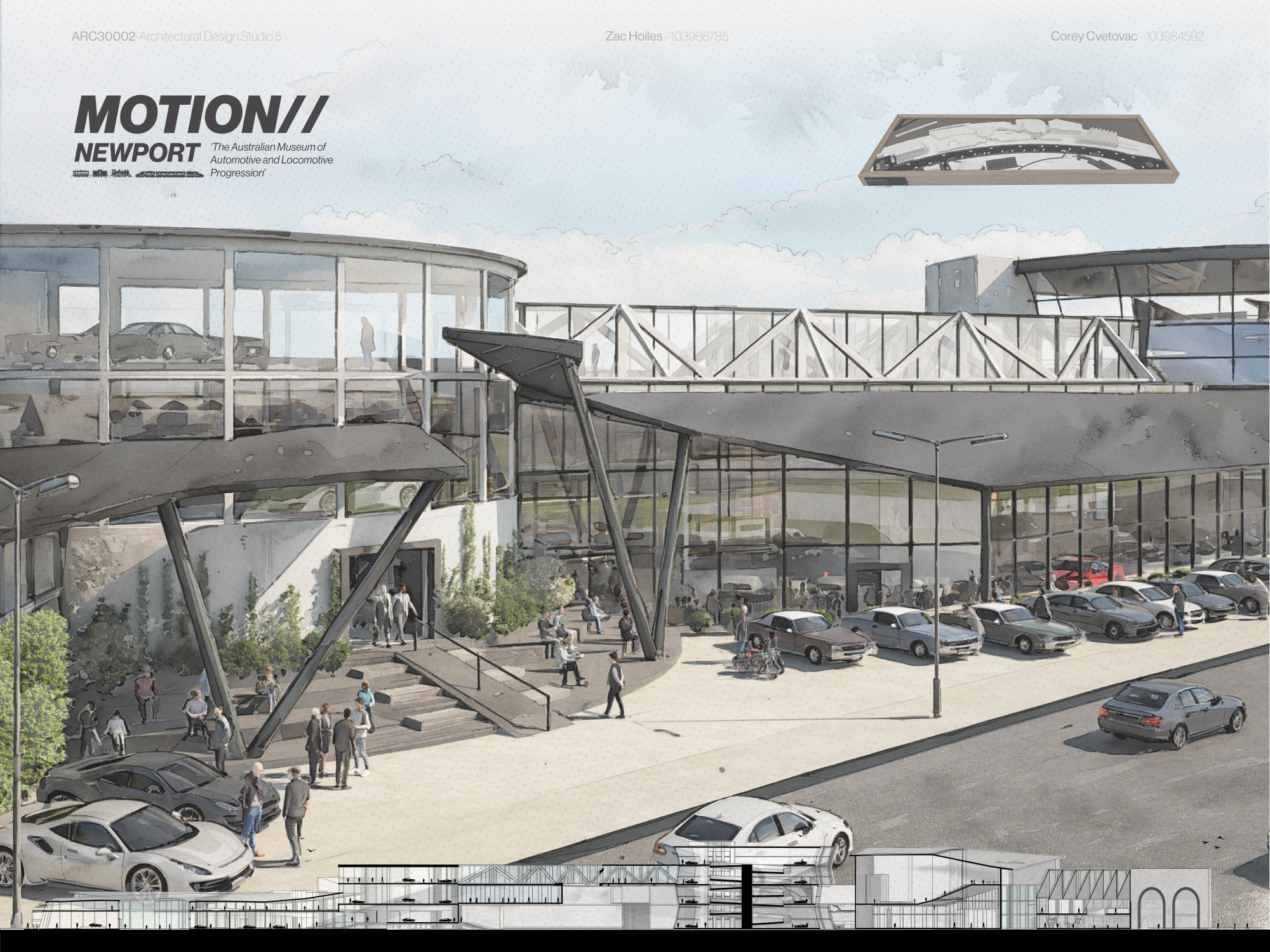 My final semester studio project that depicts the Museum of Australian Automotive and Locomotive Progression. The project features a large scale design that provides a hub for the community of Newport and wider to host events as an icon for Victoria's car and train following.