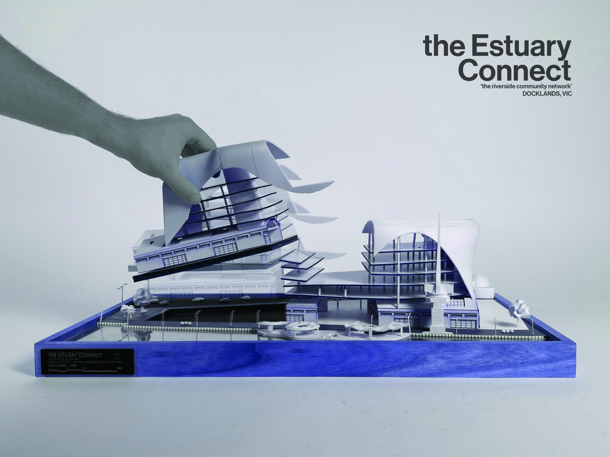 Shown is the final model for The Estuary Connect, depicting the framed site and its boardwalk along the waterfront, as well as the retained heritage boatshed and crane. The building’s structure is articulated through columns supporting each floorplate, with the main façade 3D-printed and the boatshed modelled in laser-cut white card. The western third of the model has been sectioned to reveal the intricate internal floorplates and spatial relationships within.