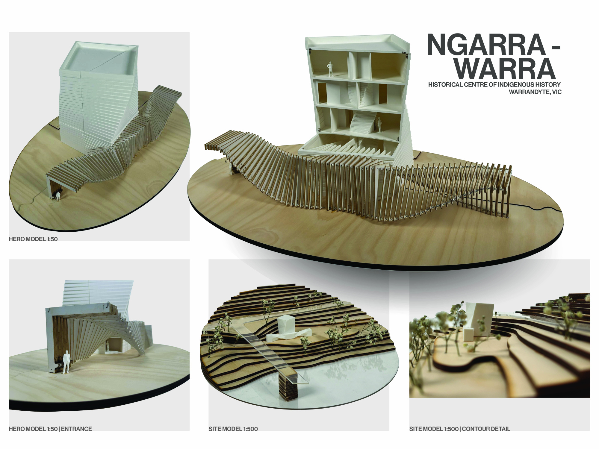 Featured is a collage of photos of the final models I created in tandem with studio partner Zac Hoiles for our brief on a culture and arts building along the Birrarung in Warrandyte. The hero model used a cross-section to gain a glimpse of interior spaces, offices and exhibition on the ground floor, while retaining the provoking entrance. The site model was enjoyable to make with the large adjacent bridge and steep site.