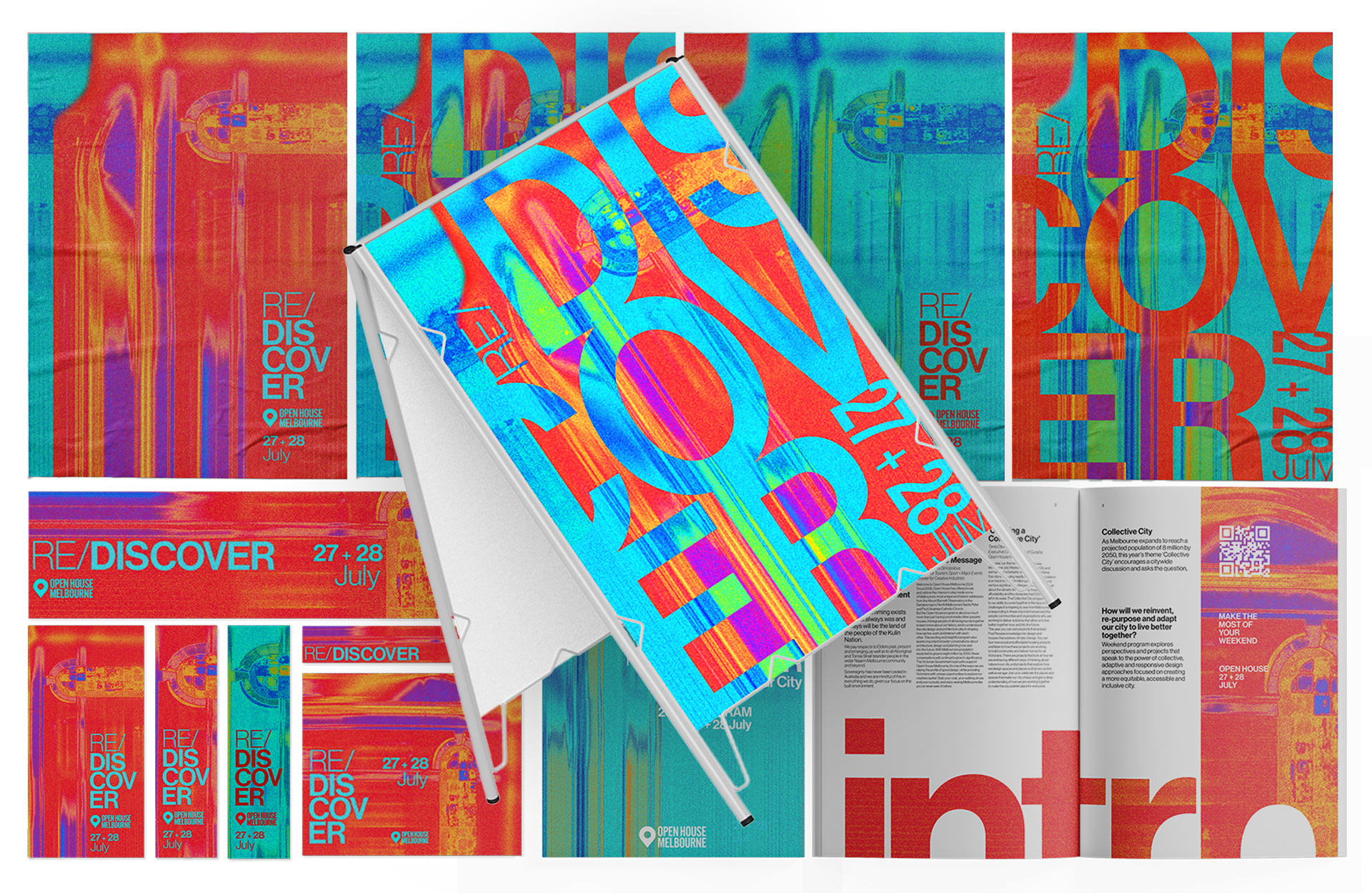 This project is a conceptual refresh of the 2024 brand identity for Open House, “Rediscover Your City.” The identity explores how people interact with and observe the built environment. Using a combination of typography, imagery, and colour, I sought to convey how the heat and energy of people move through architectural spaces.