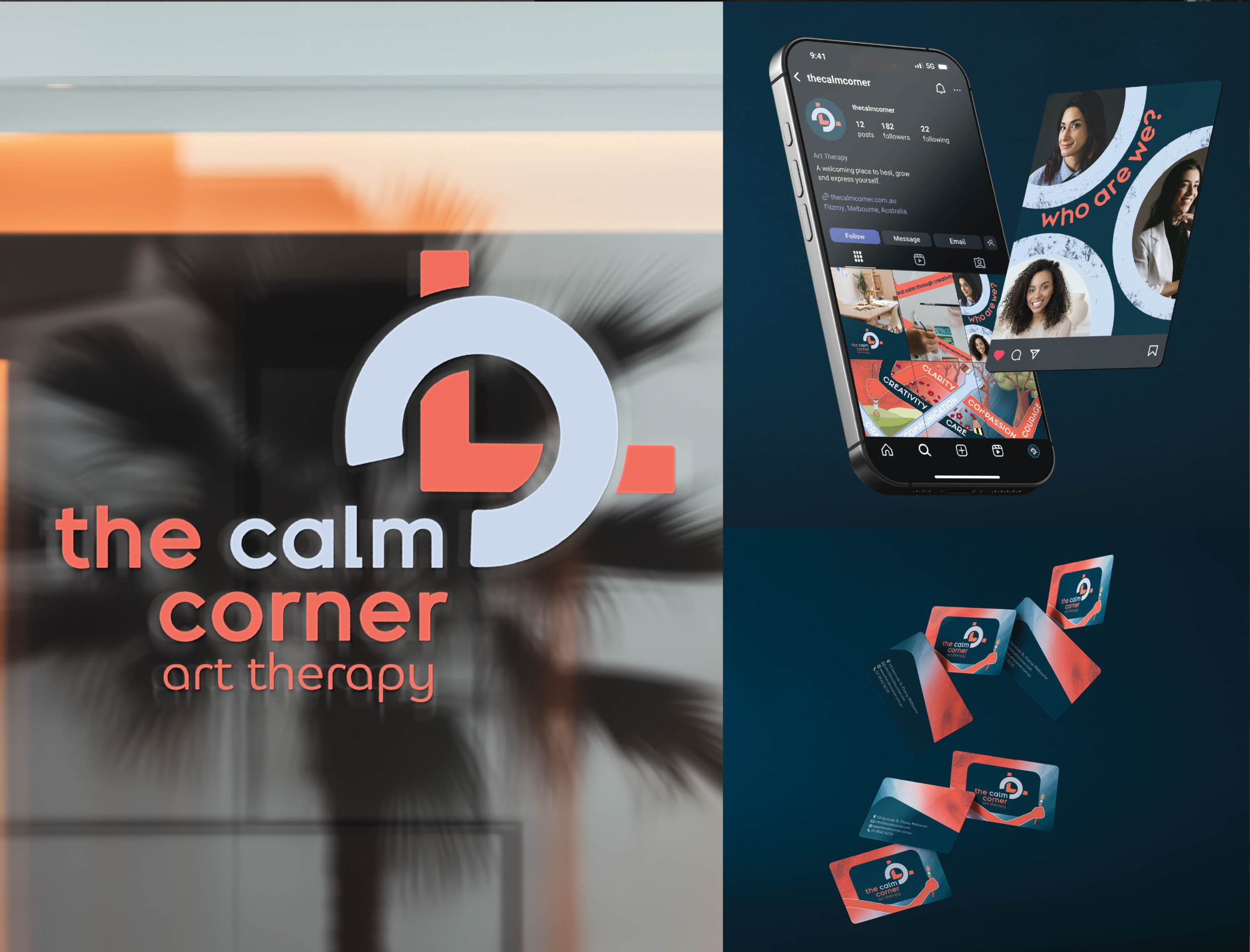 The Calm Corner is an art therapy practice that needed a brand identity that communicated warmth, approachability, and inclusivity. As a space where art supports expression and healing for people of all ages, abilities, and backgrounds, the branding reflects this through calming colours, organic shapes, and a logo that symbolises growth.