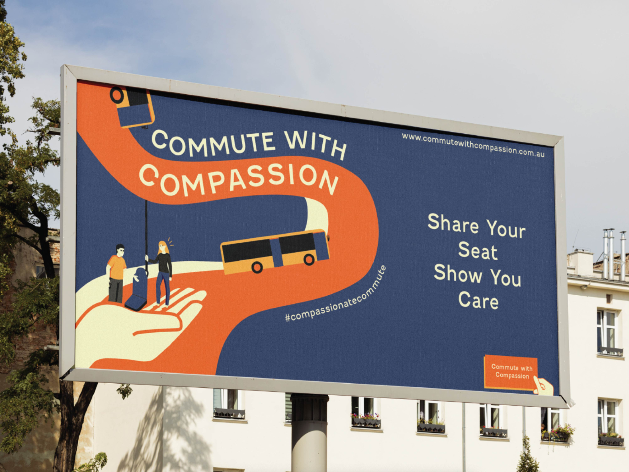 Commute With Compassion is a public awareness campaign encouraging empathy towards people with invisible disabilities on public transport. The campaign identity was designed using warm, inviting colours and fluid shapes to reflect kindness. Campaign touchpoints were also created, including a website landing page, social media posts, and wearable badges to extend visibility across both physical and digital spaces.