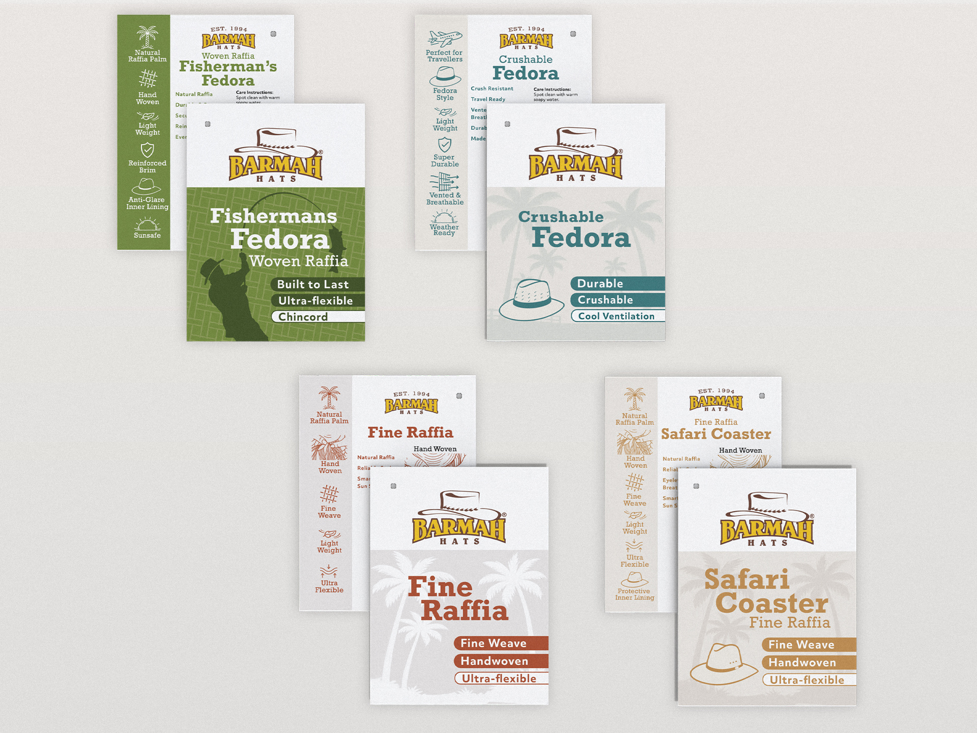 I designed this swing tag system by working with the client to pinpoint the key selling points, understand the target audience and shape what best represented their brand. I also coordinated mass print production to make sure the tags were consistent, accurate and ready for real-world use. The final outcome is a cohesive visual system where each tag feels connected to the brand, yet still gives every hat its own moment to stand out on the rack.