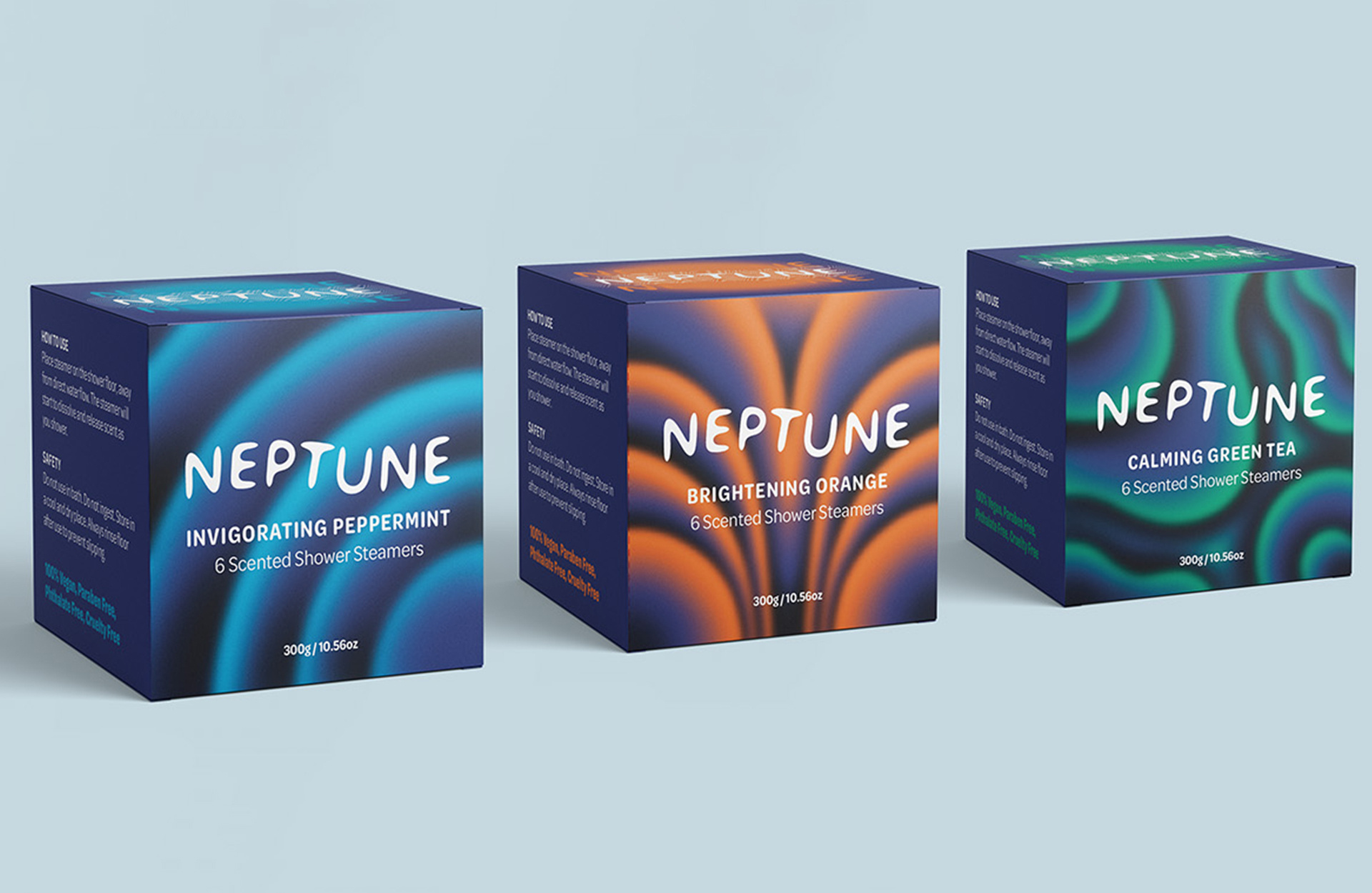 Inspired by the sensory experience of using shower tablets. Neptune is an affordable luxury. The visuals are sophisticated with touches of fun, referencing ripples and hazy mist. Using colours closely aligned with the scents they represent and simple language to appeal to supermarket shoppers. Neptune shower steamers are designed for an audience that doesn't have the time for a full wellness routine, but instead wants to relax quickly and easily.