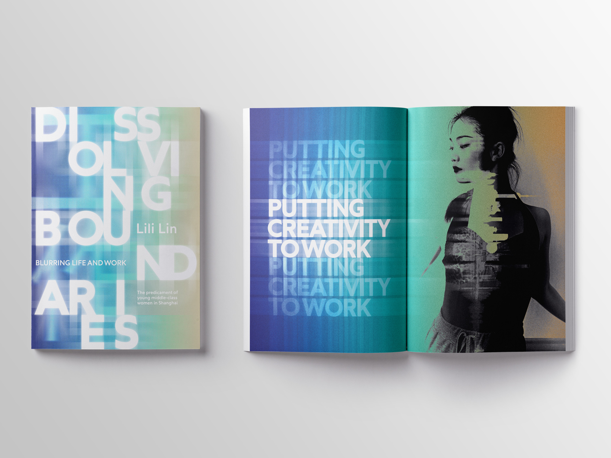 Using a right to left page format as a nod to traditional Chinese texts. The colour scheme references colours from the landscape of Shanghai. The work emphasises fast-moving disorientation and visualises the journey of the women described in the text. The motion blur effects on both the images and text evoke a sense of life speeding past you, boundaries bleeding into each other and the feeling of instability and confusion. A flexible grid system has been used to emphasise this feeling without losing structure in the text.