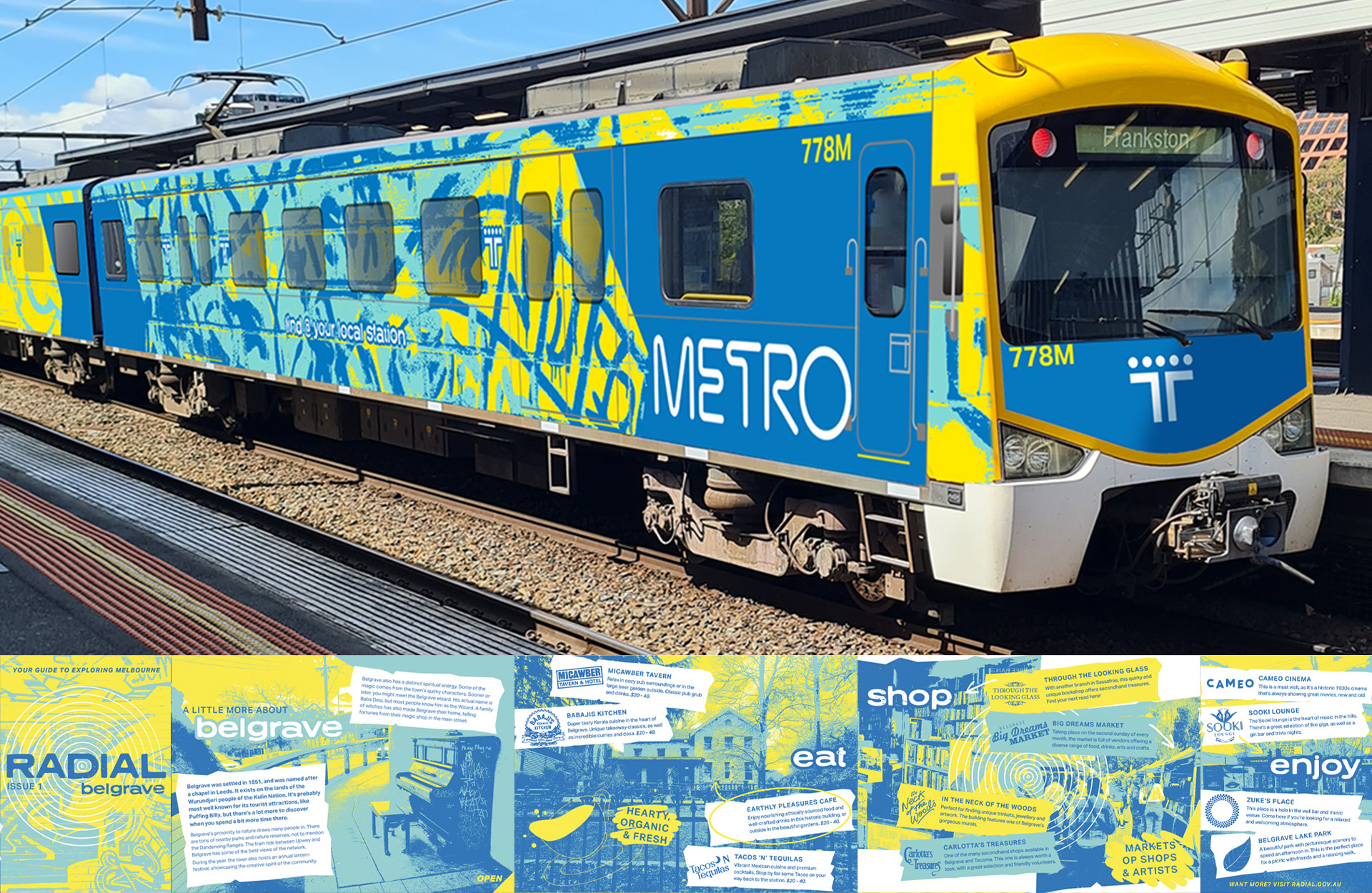 The campaign is centred around creating a recurring travel zine about locations on each train line in order to encourage more train travel organically. The colourways for the zine are taken from the train lines on the map. The aesthetic is inspired by 90s nostalgia, cut-up zines and zine culture as a whole, as Melbourne is a global hub for zines. The zine aims to authentically capture the underdog spirit of the city and its rail network.