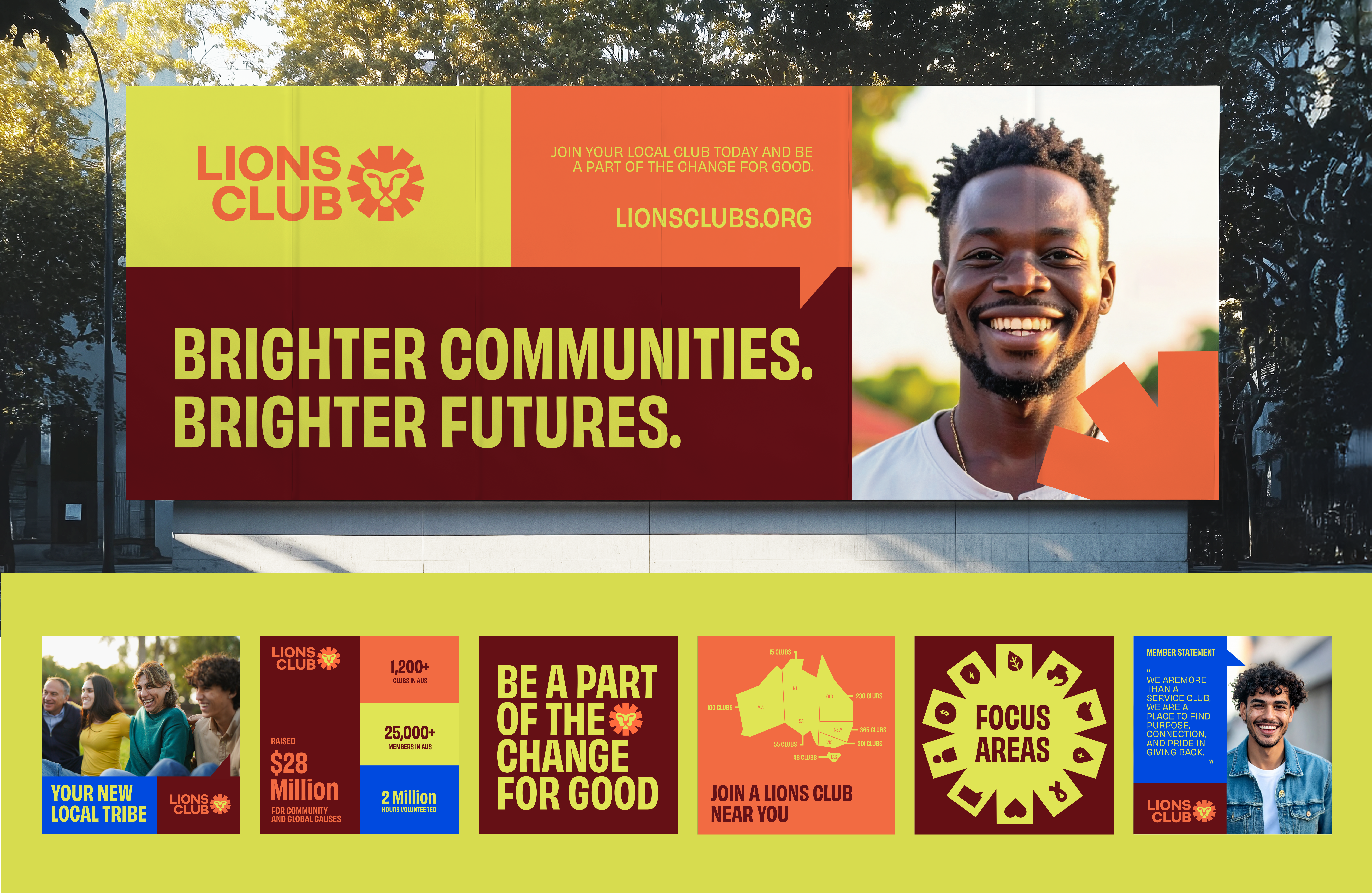A rebrand revitalizing one of the world’s largest community service networks. Bright, modern design and unified messaging reconnect the club with new generations, celebrating service, social connection, and lasting impact, breathing new life into Lions Club.