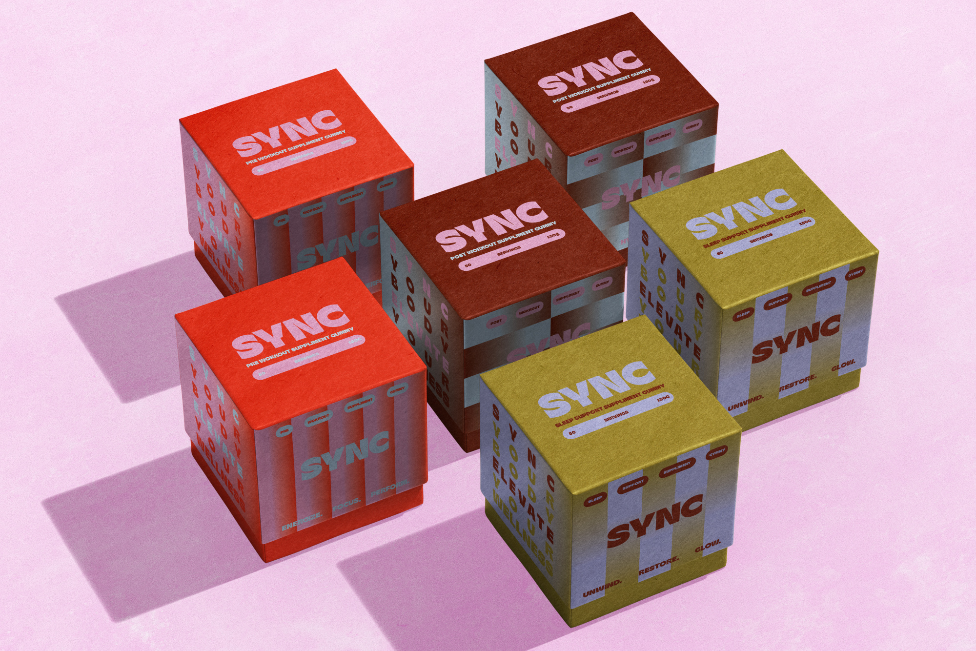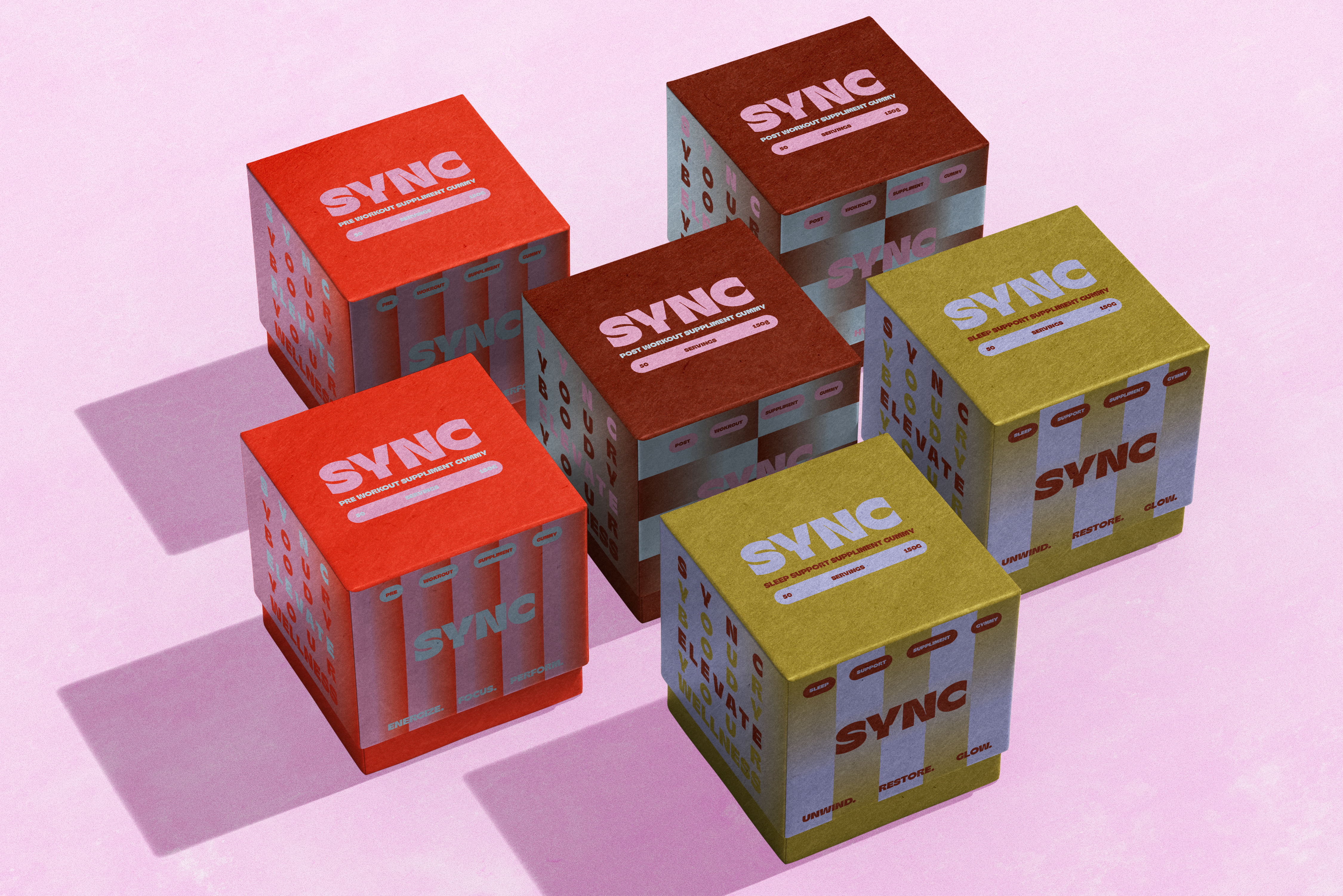 SYNC embodies calm confidence and active passion. This supplement gummy brand merges natural wellness with modern, feminine design—supporting women to feel grounded, energised, and in sync with themselves. Developed for the brief of a cohesive set of three product packages within a unified brand system.