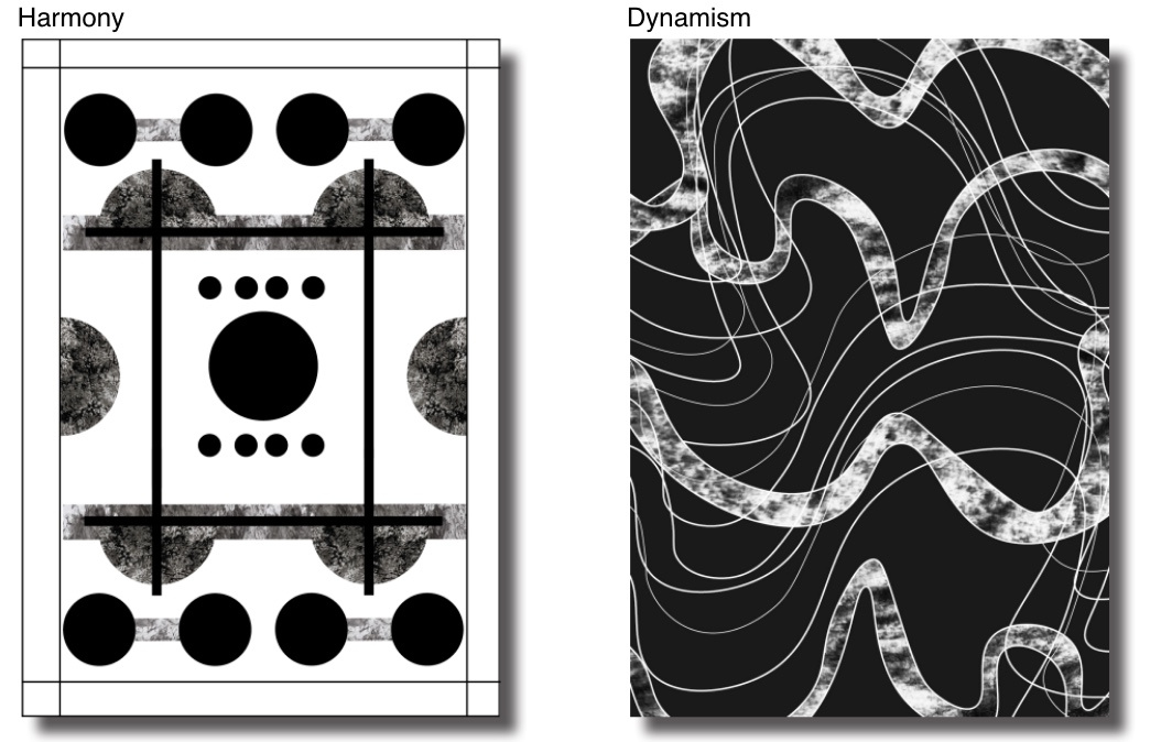 Harmony: The symmetrical arrangement of shapes and repetition of circles and lines evoke a sense of balance and calm. This design effectively conveys harmony through its mirrored layout and consistent spacing, which creates a pleasing, organised appearance that reflects unity.
