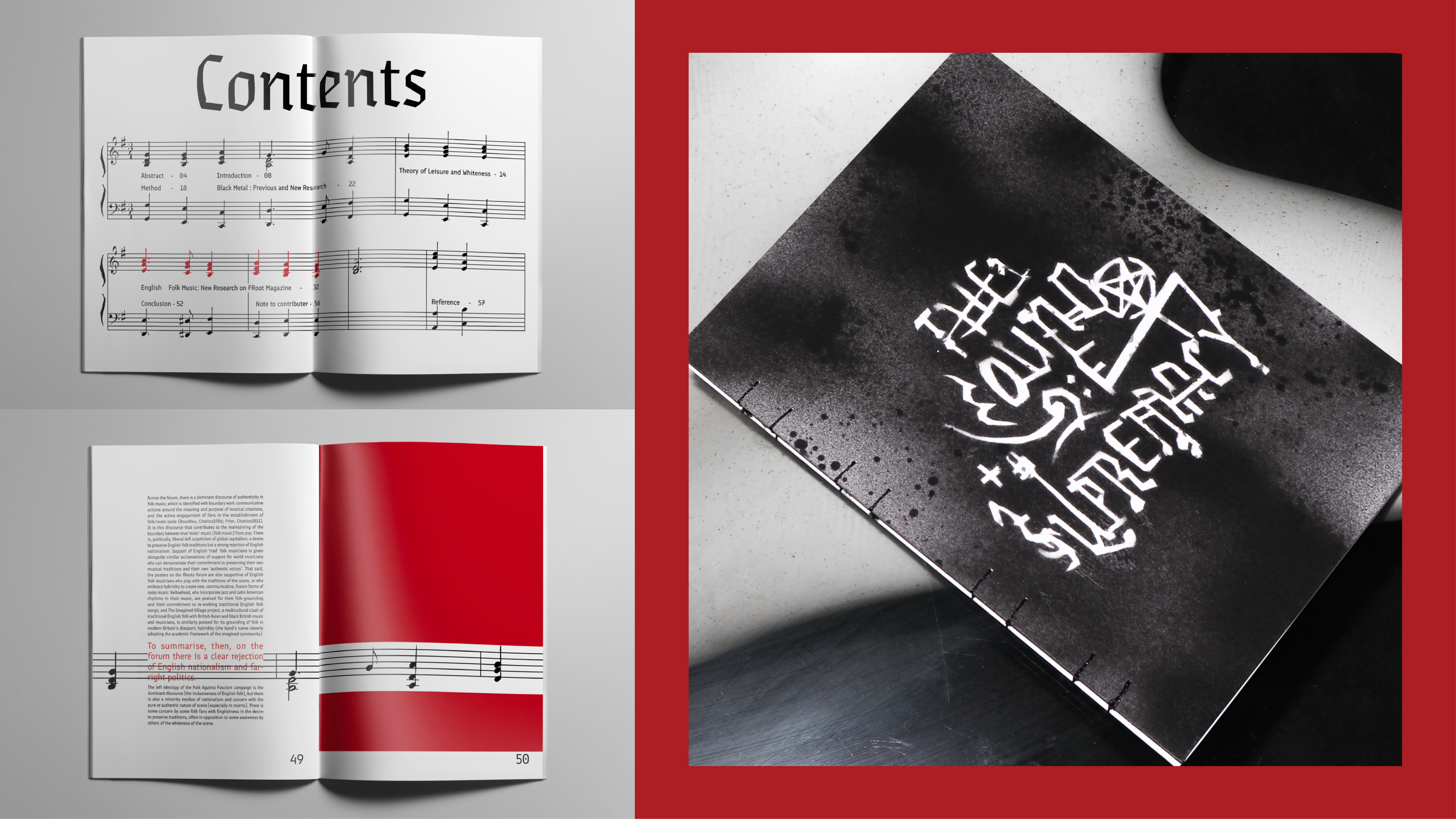 Based on Karl Spracklen's article “Nazi Punks Folk Off: Leisure, Nationalism, Cultural Identity, and the Consumption of Metal and Folk Music,” this booklet explores far-right ideologies infiltrating black metal and English folk music. The idea of ‘infiltration’ is visualized through spray paint seeping across pages, while musical scores and symbols guide the narrative. The design bridges text and image, revealing the complex ties between leisure, nationalism, and cultural identity in these genres.