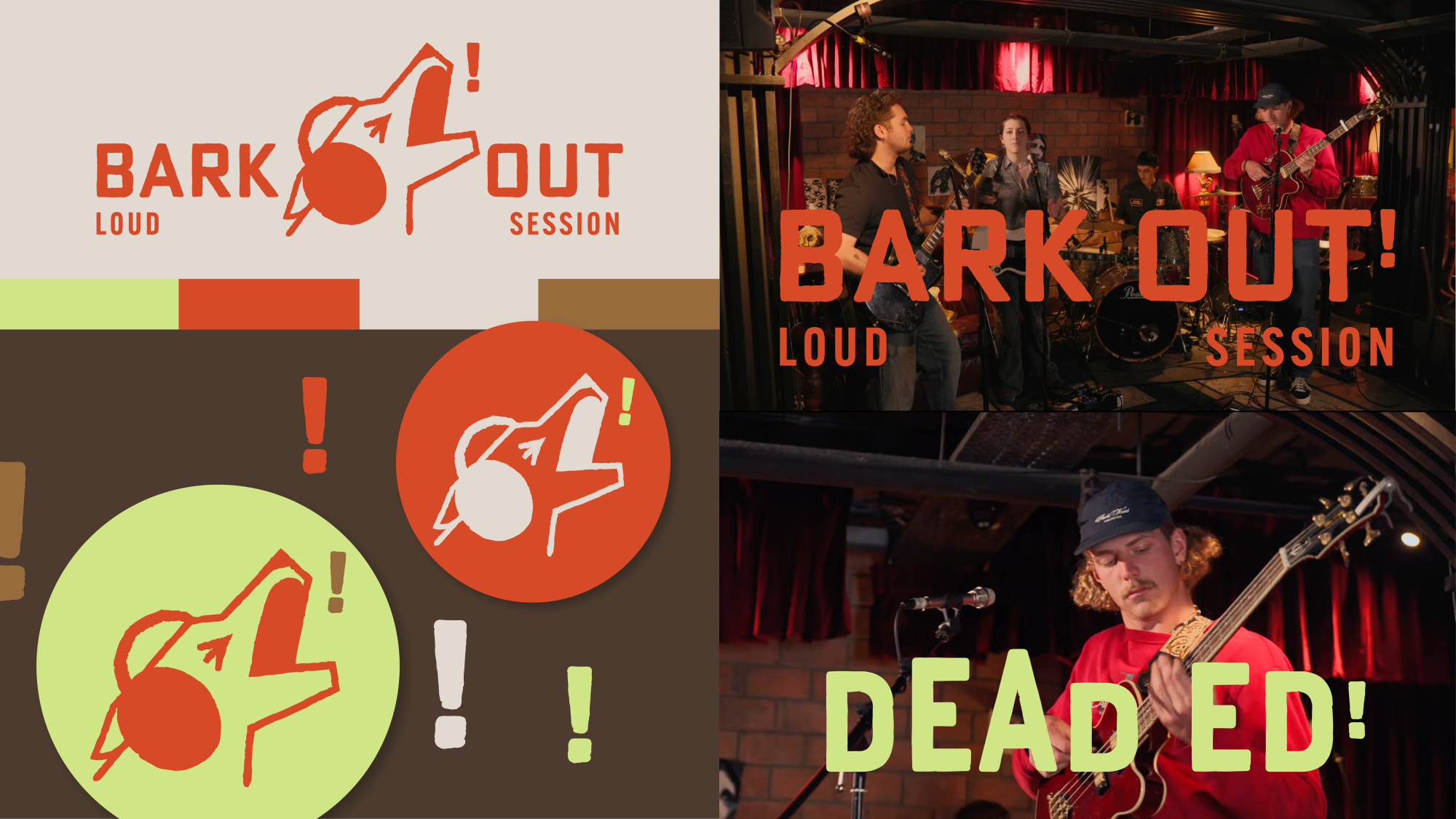 A playful identity for a YouTube live session channel featuring small gigs in third spaces. The logo shows a dog mid-bark with a bold exclamation mark, creating a strong, distinctive visual symbol for the brand.