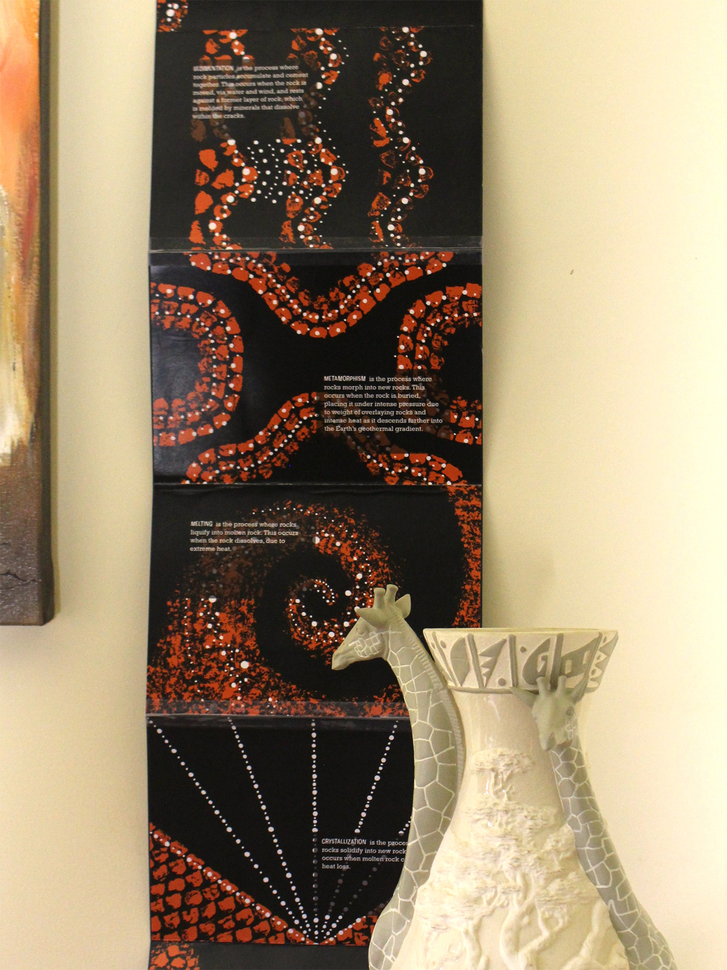 Melbourne Museum requires a brochure that engages attendees about geology. Since the tactile exhibition already caters to children, the challenge was creating a sophisticated design that intrigues an adult audience. I decided to form patterns by rock stamping to depict the rock cycle from erosion to eruption, creating an elegant souvenir.