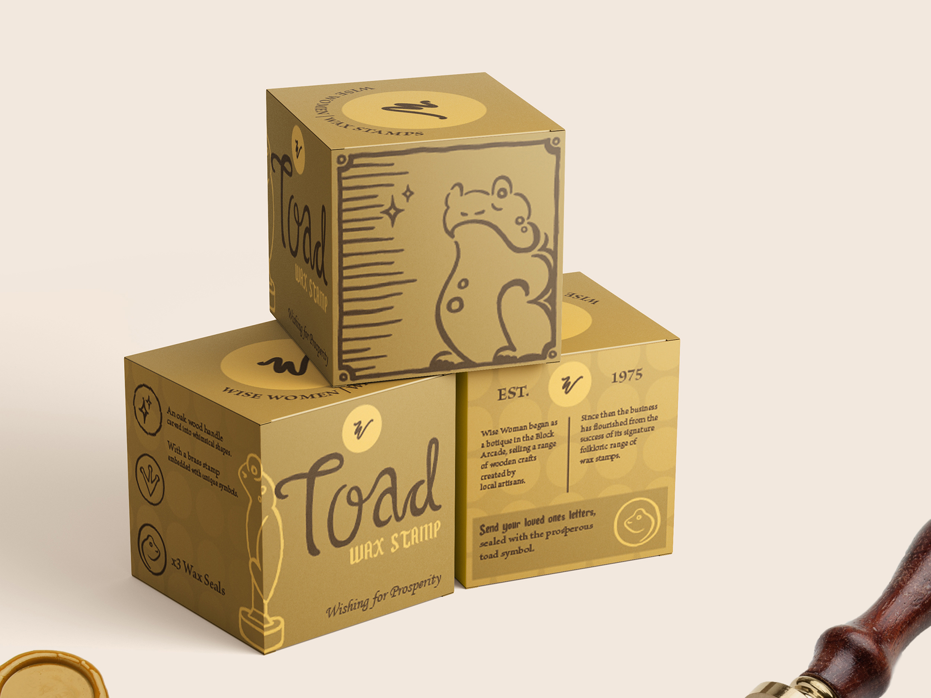 Wise Women requires packaging for their animal wax stamps, based on the classic familiars of witches, i.e. cats, owls, and toads. To immerse customers into their old-timey hand-made crafts, I hand illustrated cursive and lino-stamped inspired decals, transforming a mundane box into a quaint curio.