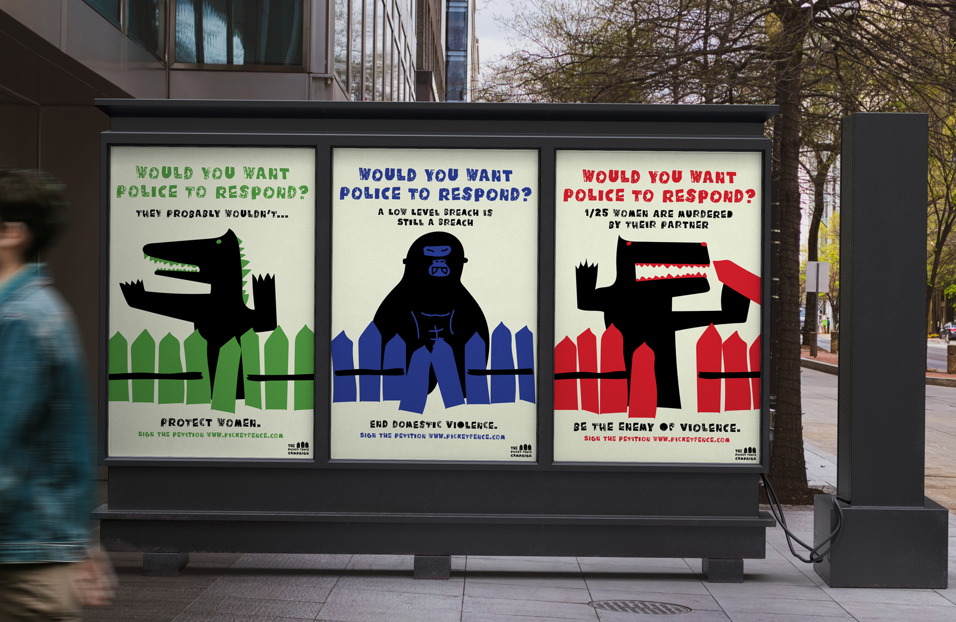 The Picket Fence Campaign raises awareness for police inaction regarding 'low-level breaches,' a significant factor in domestic violence. In Australia, an average of one woman was killed every eight days by an intimate partner in 2023-24 (Australian Institute of Health and Welfare, 2025). A low-level breach refers to minor violations of a victim's personal safety in a relationship, characterized by behaviors such as unwanted contact or property damage that often go unaddressed by police. These behaviors test the limits of police response, allowing partners to escalate to more serious forms of violence. Utilizing child-like illustrations of monsters, the unified brand identity symbolizes the fear experienced when a dangerous partner breaches the domestic home. This approach evokes concern and action, encouraging viewers to sign the petition and support the movement to protect women from 'low-level breaches,' emphasizing that a breach is still a breach, regardless of its severity.