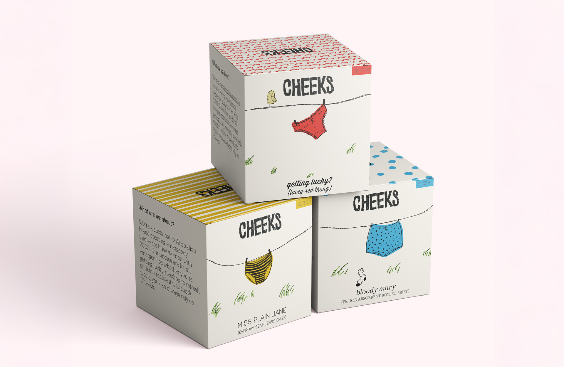 This is Cheeks a charming and playful emergency underwear brand designed for busy women with PCOS. With a coherent brand identity applied across printed packaging and digital platforms, Cheeks offers convenient, reusable underwear for emergencies and special occasions, available in vending machines at train stations, offices, and universities. The brand identity features vibrant illustrations and age-appropriate humor, making the products approachable and fun to use. This design choice enhances the user experience, transforming emergencies into manageable moments of empowerment. By breaking the stigma surrounding period emergencies, Cheeks encourages women to feel confident and supported. With a focus on sisterhood and reliability, Cheeks establishes itself as a brand that women can connect with and trust.