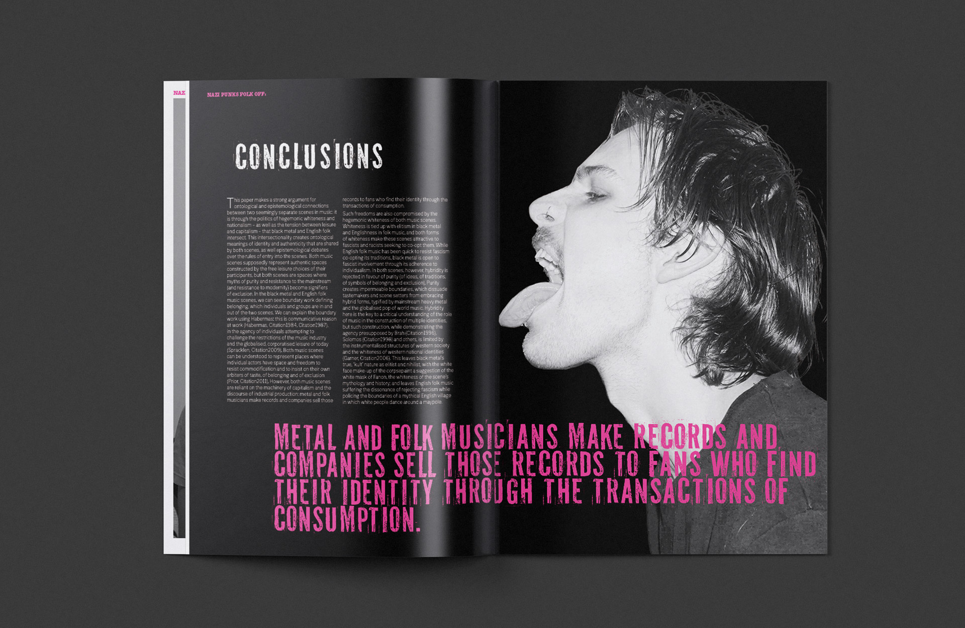 Presenting Karl Spracklen’s, Nazi Punks Folk Off, a print publication that dissects the infiltration of Neo-Nazis in the punk music scene of the 1980s through dynamic visual strategies. This visual language employs a striking color palette of black, white, and hot pink, capturing the raw, chaotic energy of punk culture. Utilizing my own photography, the design brings to life the rebellious spirit of the era, while bold contrasting colors reflect the defiance inherent in punk aesthetics. The typography mimics the hand-drawn style characteristic of punk zines, enhancing the publication's authenticity. By incorporating dynamic imagery and a layout that evokes movement and chaos, this publication engages readers and immerses them in the historical context of the punk movement, to provoke thought and discussion about its cultural implications.