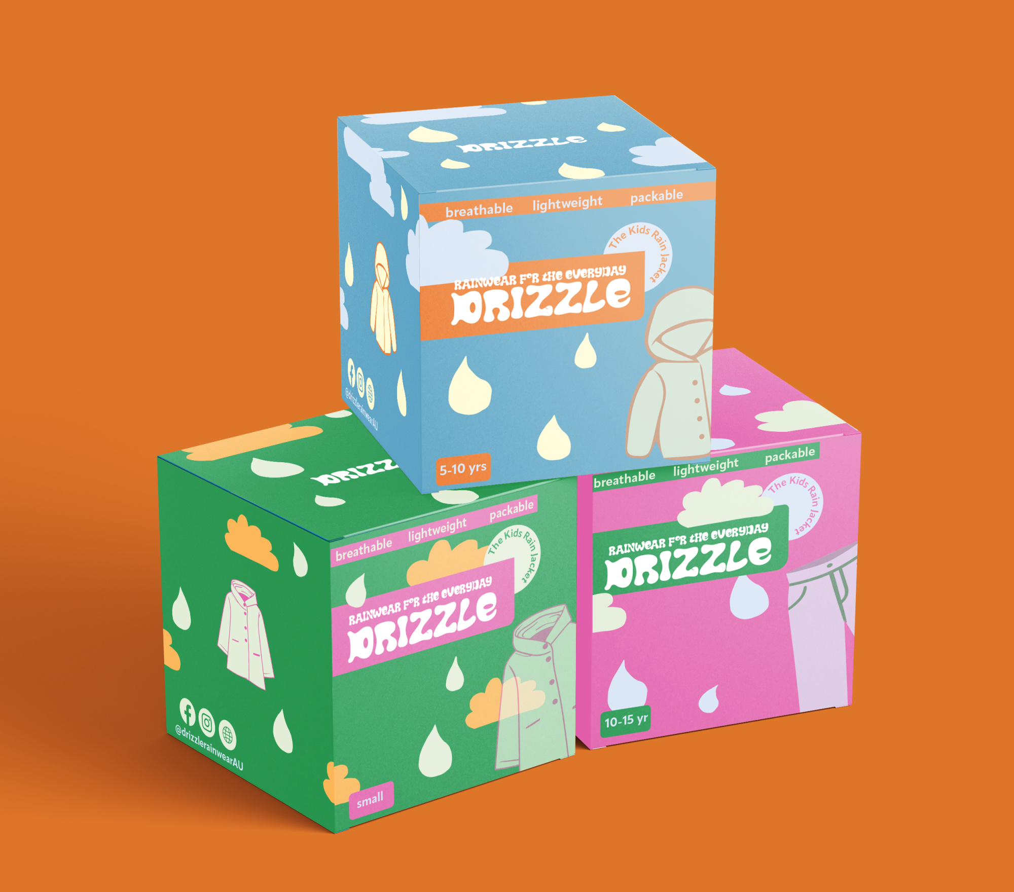 A playful and illustrative packaging concept for compact rainjackets and rainpants. The designs create a warm, fun and engaging tone for the brand and the targeted products to engage children and parents.