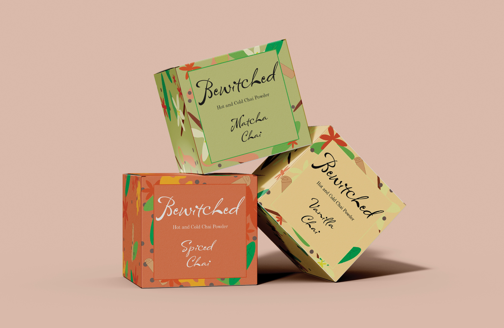 This project involved designing the branding and packaging for Bewitched, a powder chai brand created to charm and delight tea lovers. The packaging features vibrant, illustrative artwork that reflects the unique flavours and ingredients of each blend, creating a visually engaging experience that invites consumers to explore and enjoy the product. Bold colours, playful patterns, and detailed illustrations were used to convey the brand’s magical and whimsical personality, making each package feel enchanting and memorable. The design balances aesthetic appeal with clarity, ensuring that key product information is easily readable while maintaining a sense of fun and creativity. Overall, the project aims to captivate the audience, reflect the warmth and richness of chai, and create a brand identity that stands out on shelves while delighting consumers with every cup.