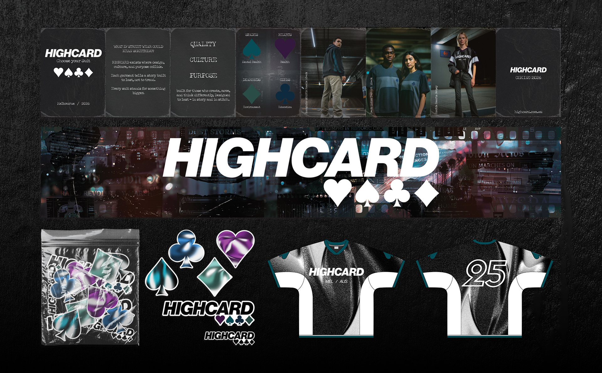 A conceptual streetwear brand redefining modern streetwear through design, culture, and purpose. Each suit—Spades, Hearts, Clubs, and Diamonds—supports a social cause. The identity blends minimal luxury with nostalgic design, unified through bold storytelling, packaging, and print touchpoints that merge visual refinement with a meaningful message.