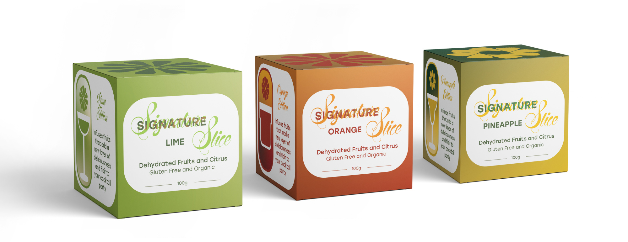 The solution was Signature Slice, the dehydrated fruit and citrus brand that utilizes three distinct colour pallets that blend together to create a strong and cohesive brand image that stands out on the shelf.