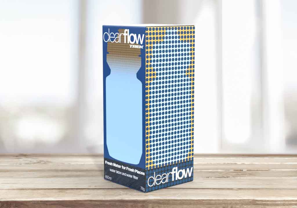 ClearFlow Trek is a packaging concept for a water bidon designed for bike-packers exploring remote areas. The water-resistant packaging doubles as a functional filtration system. Once emptied, it can be filled with layers of rocks, sand, and gravel to filter water on the go. The graphic design visually represents this filtration process through layered textures and clear instructional elements.
