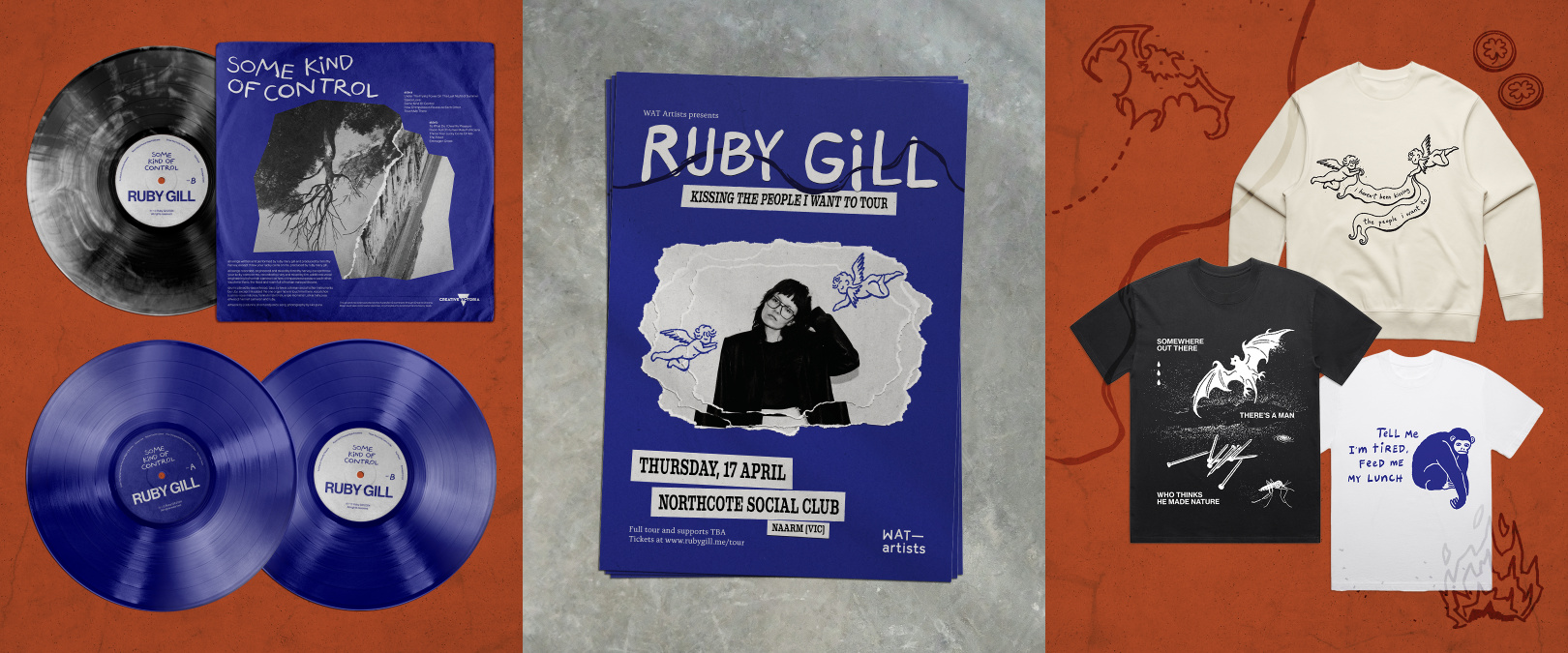 This project included creating a vinyl back cover, lyric sheet, tour poster, and supporting merch for Ruby Gill's album Some Kind of Control. The album is intimate, witty, and beautiful, so I opted for something textured and raw, minimal but edgy.