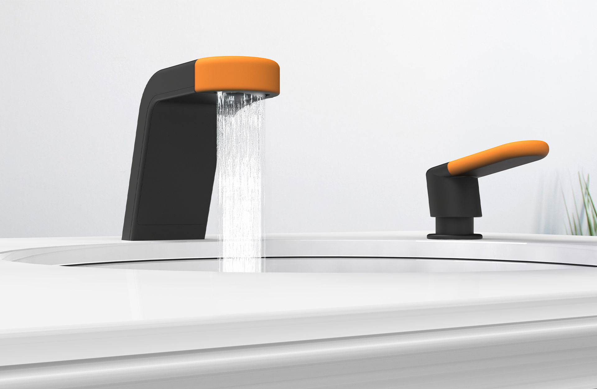 The Forma is a mixer tap designed for visually impaired users. The bright coloured silicon on the front of the tap and handle assist with visibility in addition to the large flat form and the contrasting black in a traditionally white bathroom.