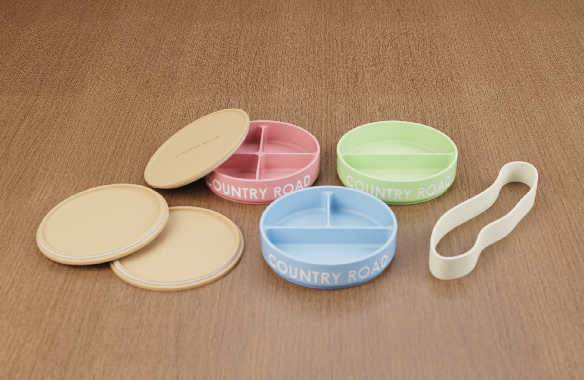 A colourful set of stacking bowls designed for Australian company Country Road. All bowls in the set have a divider creating a number of smaller sections, including a two section, three section and four section bowl. They are designed for picky eaters, with the dividers preventing foods from mixing while maintaining Country Road's design language.