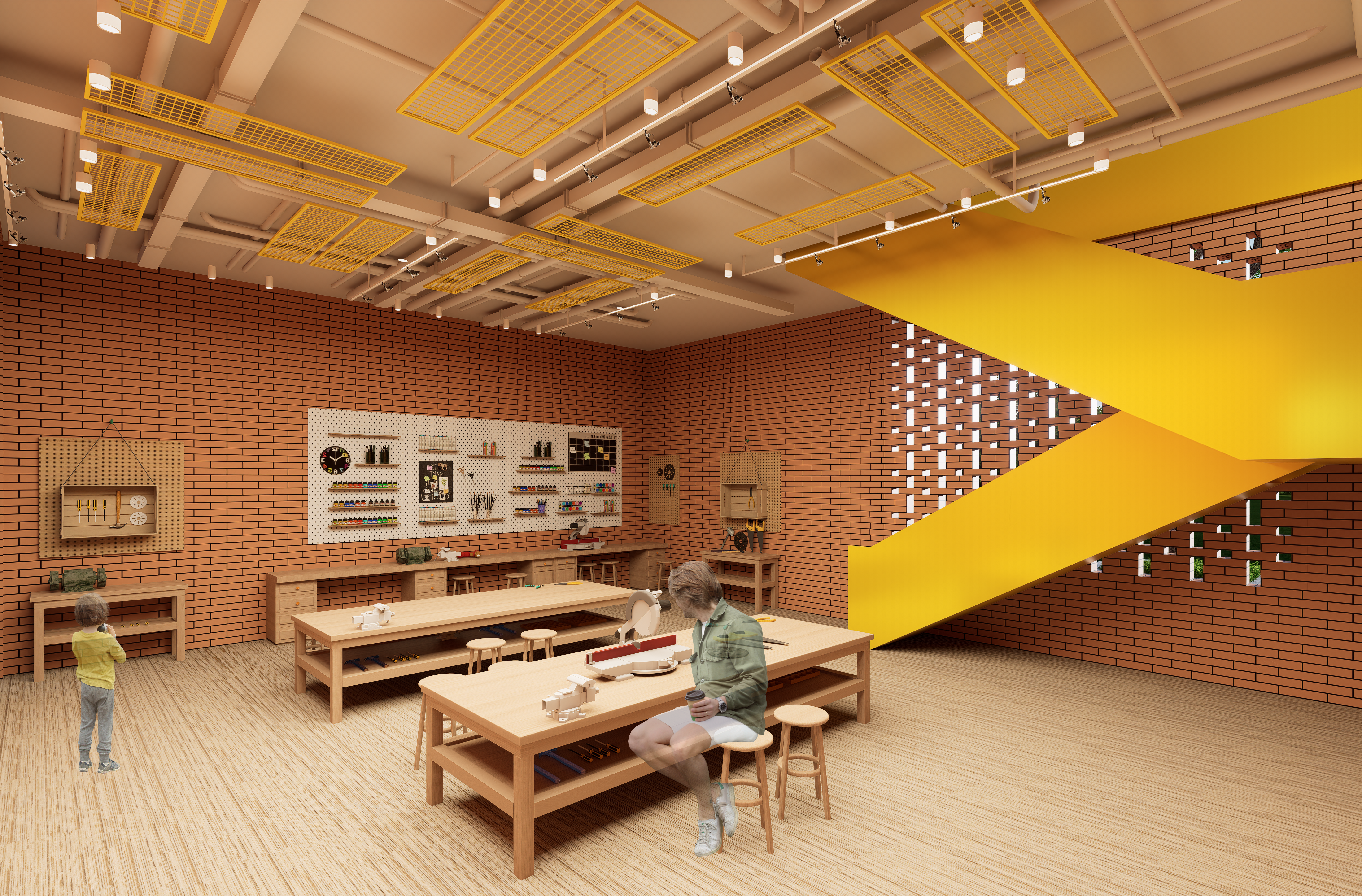 The Forge breathes new life into the Box Hill Brickworks, creating a sustainable, inclusive community centre where culture, nature, and connection thrive. The workshop features a striking yellow steel staircase, exposed brick walls, and timber flooring, while the industrial-style ceiling echoes the character of the original Brickworks factory.
