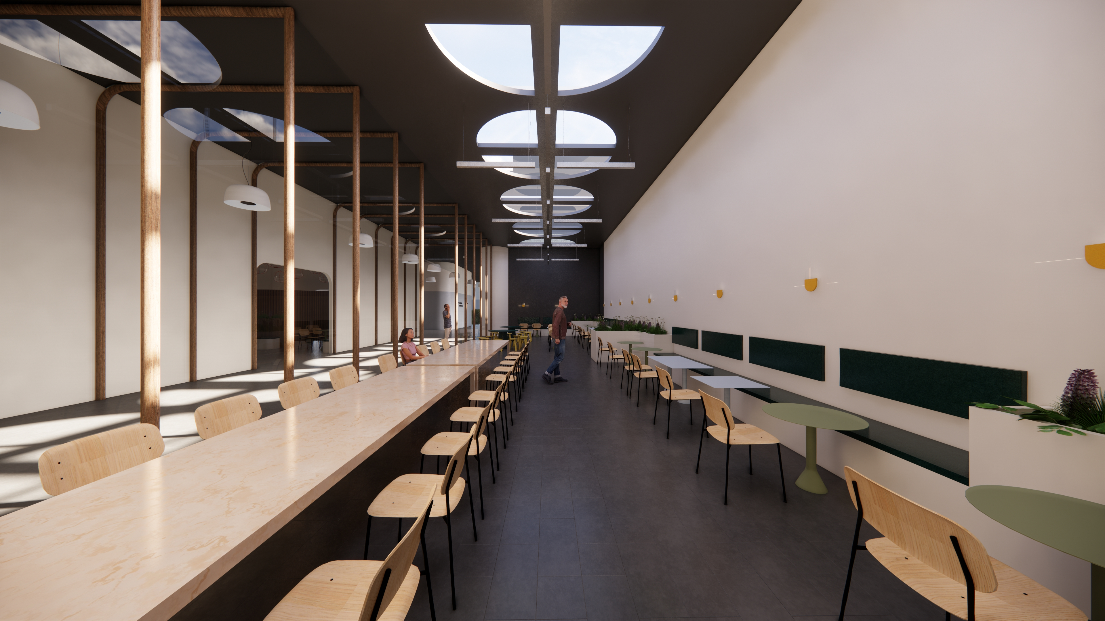 A Second Chance Project — Social Cohesion seeks to strengthen community unity through social enterprises that fund programs supporting the homeless. The dining and gathering space is designed to foster connection between guests and the broader community. A central sky void introduces natural light that contrasts with the reception area, symbolising openness and hope while creating a welcoming, uplifting atmosphere.