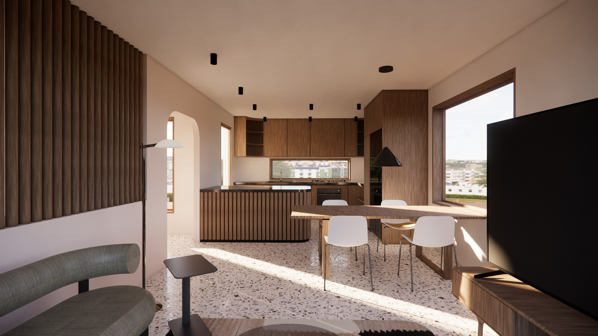 This project focused on designing a modular apartment unit that could be replicated on-site to form a cohesive “village” for students and university guests. The kitchen space was designed with warm tones and natural textures to evoke a welcoming, homelike atmosphere.