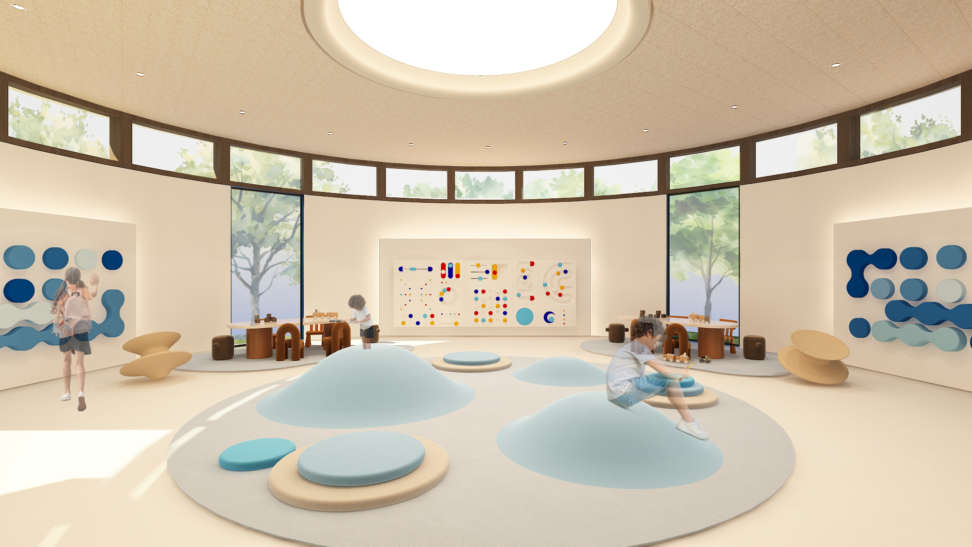 The sensory quiet room accommodates both high and low-stimulus needs for the neurodiverse children with flexibility control, like adjustable lighting to avoid overstimulating, movable furniture like bean bags, and seating with soft materials to absorb sound.
