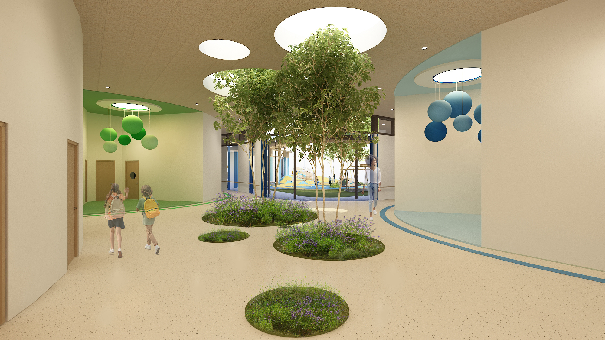 Bringing greenery into the interior to create a sense of calm and connection to nature, while natural sunlight filters through the central void to brighten up the space. Colour is used thoughtfully as a visual wayfinding tool, helping neurodiverse children navigate to different classrooms.