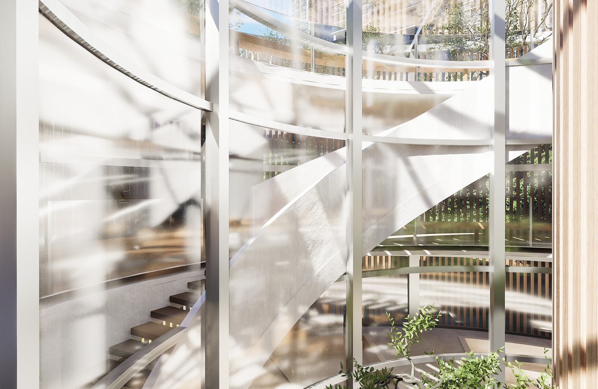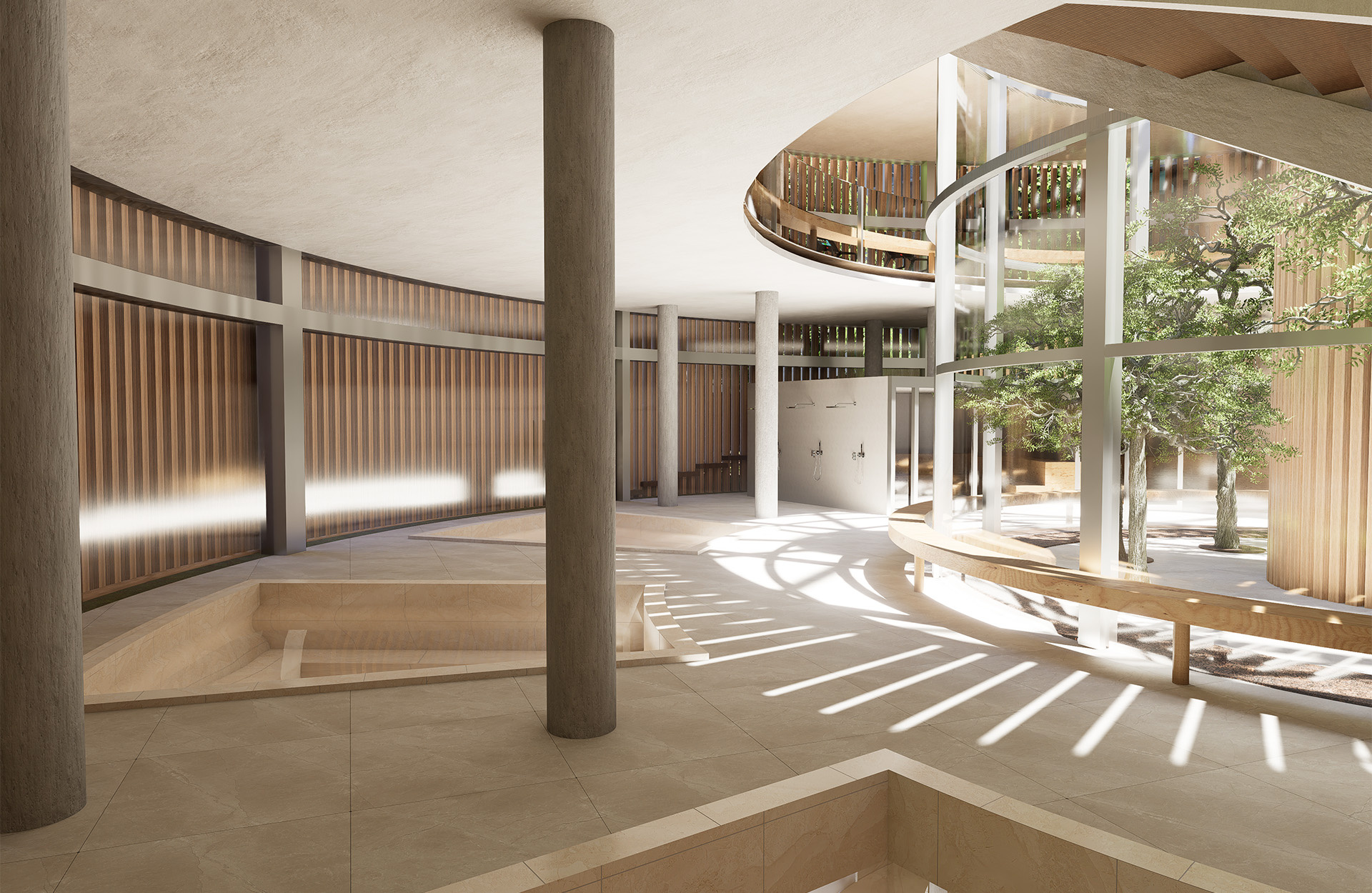This render is from the project Longevity Living highlighting the amenities on the ground floor of the wellness center. Every material and element in intentional to create a sense of calm, from the timber facade exposed by the glass to the warm tones in the tile.