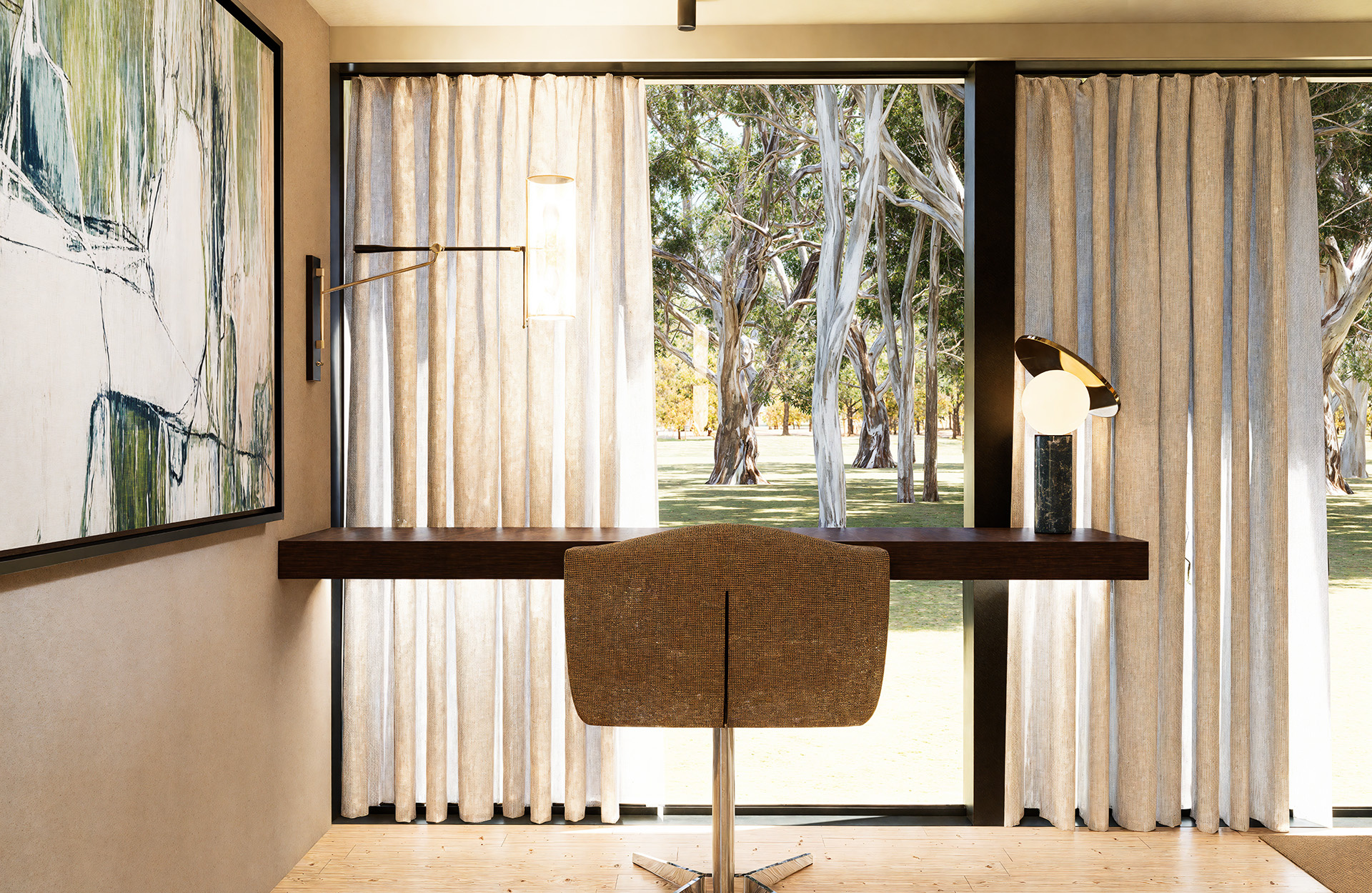 Bush Dwelling was created with the site as the center focus as it invites it's surrounding in through floor to ceiling windows allowing the trees to become part of the interior space. Here we see picture the study area that looks out to the peaceful bush views.