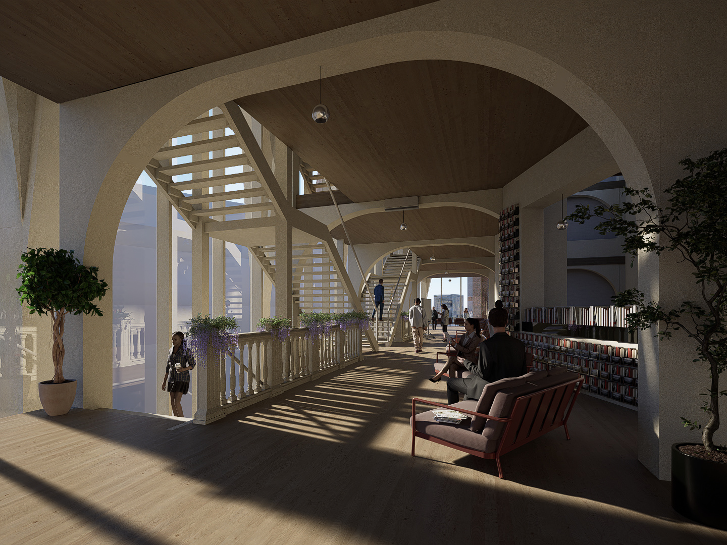 An interior render of AEON that showcases the integrated bookshelves situated next to the central light-well. This design ideology was used to allow for ease of public circulation, design porosity, as well as little moments that happen only through the gaps between the feature shelves.