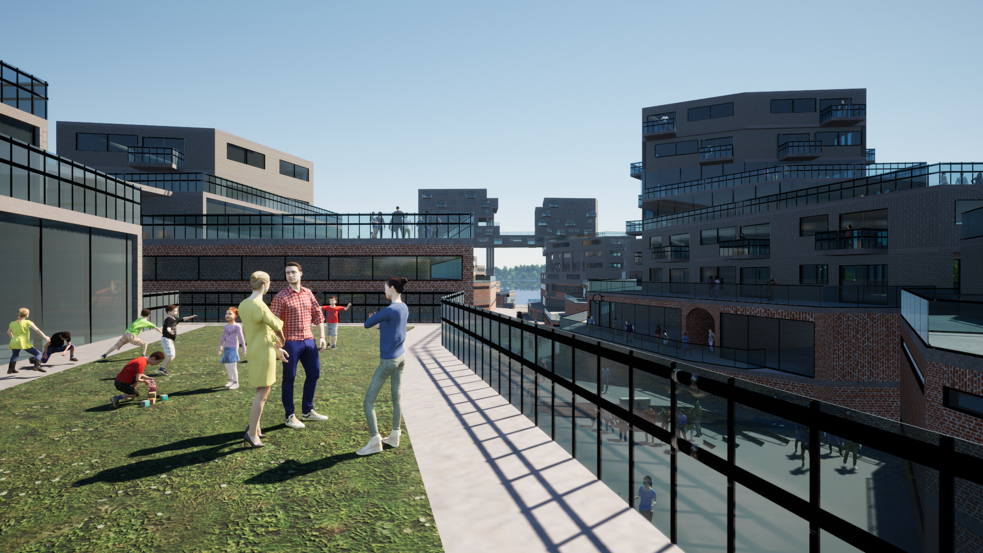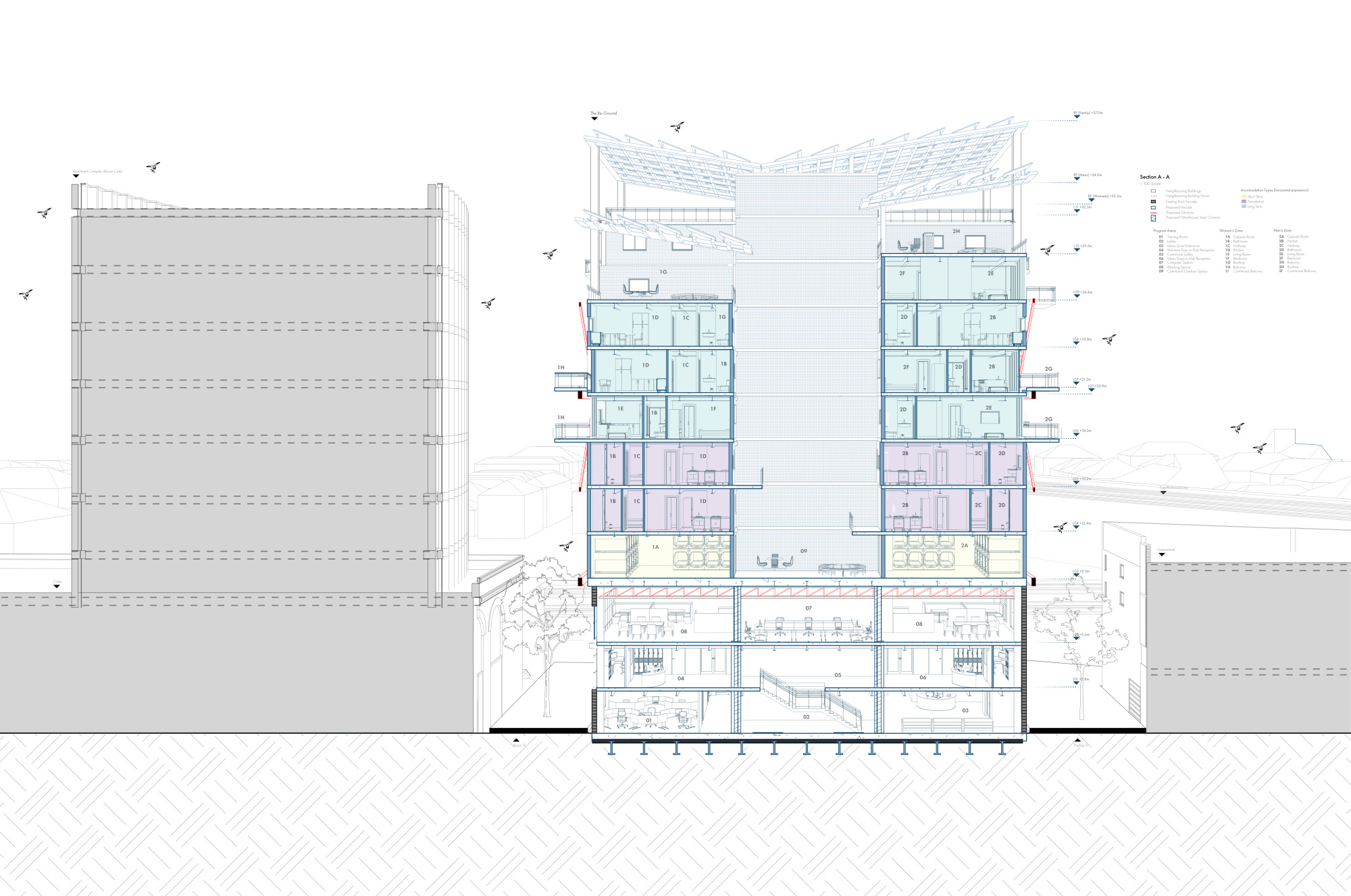 The sectional perspective highlights the two main accommodation zones, separated to support both female and male residents, with a dedicated family area positioned at the rear for privacy and safety. The design integrates a variety of accommodation types: short-term, transitional, and long-term, allowing residents to move through different stages of support. The existing warehouse structure becomes a shared hub for development and communal programs, providing spaces for learning, connection, and personal growth.