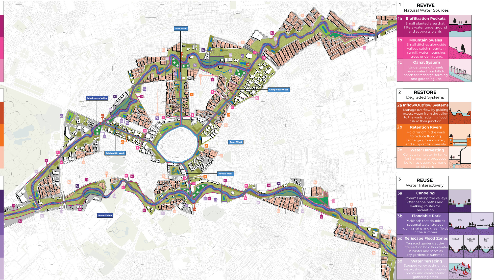 This masterplan proposes a visionary urban renewal strategy for Erbil, Iraq, one of the world’s oldest continuously inhabited cities. Using projected 2099 climate and water data, the project introduces a network of water management strategies to address future scarcity. By reviving ancient water sources and linking them with new systems, the proposal creates a continuous, citywide water network that supports resilience, sustainability, and cultural continuity.
