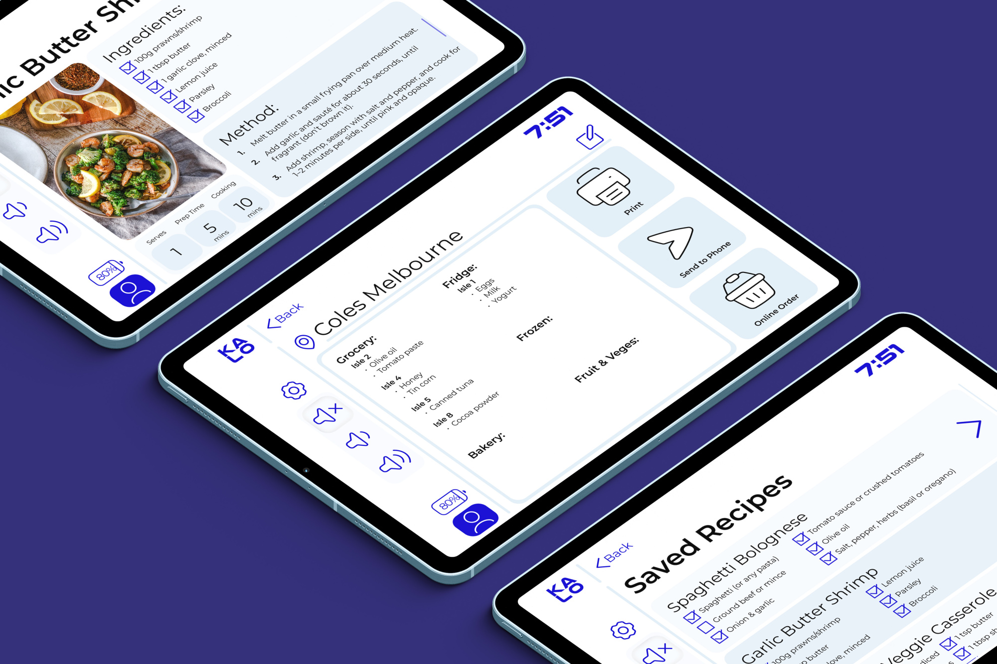 KALO - or "Kitchen assistant, living organiser" manages the inventory of a person's kitchen, including the fridge, freezer and pantry. It keeps track of expiration dates and makes shopping lists based on what users want to cook. It was a group project with four other people for Maureen Thurston-Chartraw, the CEO of Access Partners.